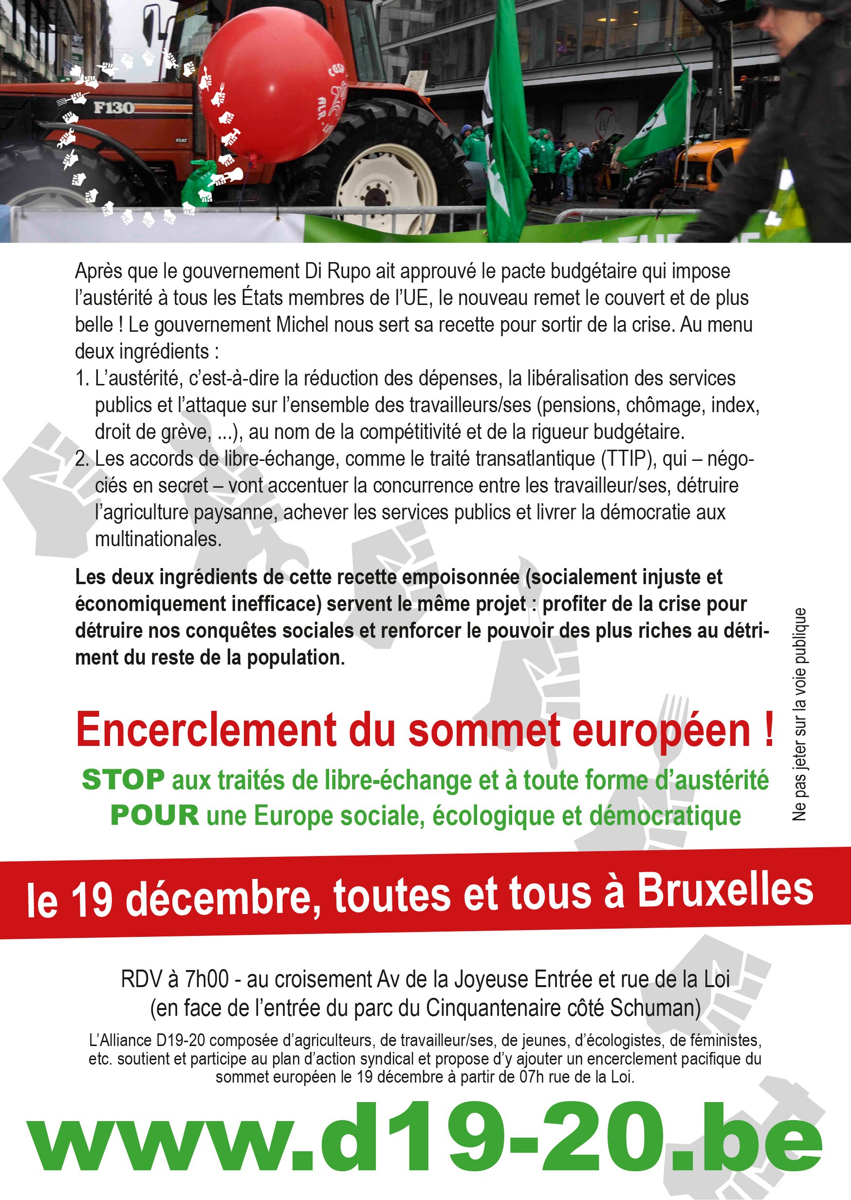 Nous appelons toutes les organisations et les personnes à faire du 19 décembre 2014 une journée d’action et de convergence de luttes. Prenons les rues pour rappeler à nos dirigeants que l’intérêt général n’est pas celui des multinationales et des lobbies, que la démocratie ne fonctionnera pas sans nous. Seule une Europe réellement sociale et démocratique pourra répondre aux besoins sociaux fondamentaux des populations et garantir un avenir de prospérité pour toutes et tous, dans les limites de la nature. Il est plus que temps d’arrêter ces sommets de massacreurs ! Occupons les rues de Bruxelles vendredi 19 décembre. L’Alliance D19-20 y sera. Elle appelle tous les mouvements, organisations, plateformes à faire de même afin de construire une action la plus massive possible ! Leurs profits, c’est le fruit de notre travail qu’ils s’approprient ! L’Europe, c’est nous. vendredi 19 décembre 2014 ! Pour une éducation, un travail, une alimentation, des services publics, un environnement de qualité, retirons le TTIP ! Contre les coupes budgétaires, refusons de payer la crise des banques ! Appel signé par : Alliance D19-20 (Be), Union syndicale Solidaires (Fr),
